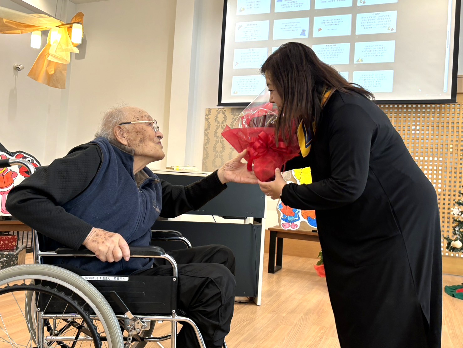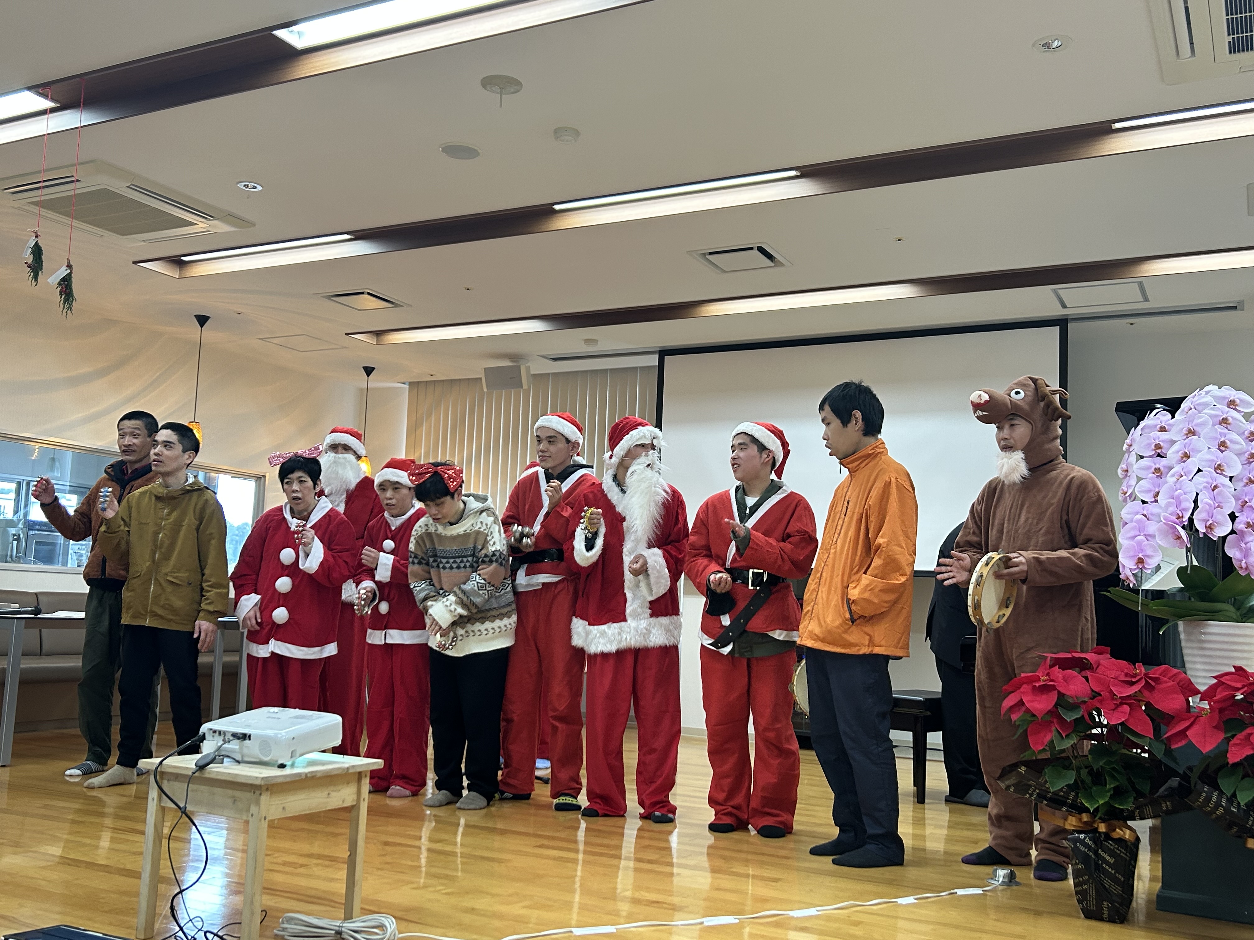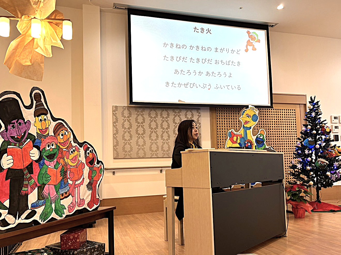 サプライズでは、サンタに扮した皆さんが、[あわてんぼうのサンタクロース]を合唱😊